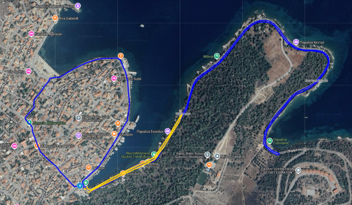 Ακτή Οιάνθης και το Κιόσκι/Μόλος. Η διαδρομή θα ανηφορίσει μέχρι τον Κάβο και θα ακολουθήσει την πορεία της παραλιακής οδού ως την Πλατεία Χηρόλακα. Στροφή αριστερά και…μια μικρή κλίση του οδοστρώματος θα είναι η πρόκληση για όλους…για να φτάσουν μέσω της οδού Στρατηγού Καμμένου στην πλακόστρωτη Πλατεία Μανουσάκια/Ηρώων. Η συνέχεια της διαδρομής θα περάσει μέσα από την «καρδιά» του Γαλαξιδίου και η κατηφορική κλίση σε κάποιο σημείο της οδού Νίκου Μάμα θα αναπτερώσει τις δυνάμεις των συμμετεχόντων για να τερματίσουν στην ομώνυμη Πλατεία, από όπου και ξεκίνησαν, με άνετο ταχύ διασκελισμό κι ένα μεγάλο χαμόγελο, την πιο όμορφη διαδρομή που έχουν διανύσει ποτέ!